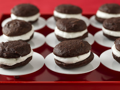 Match your cookies up in size - tops and bottoms. Use a big spoon and plop some filling on the bottom cookie and then add the top cookie. And there you have it - a Whoopie Pie.